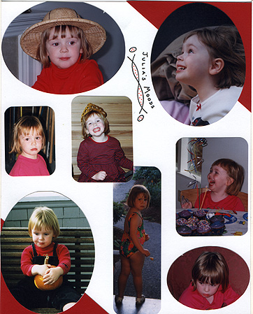 - The many moods of Julia age 2-4. Clockwise from upper right: Story time at Third Place Books, her third birthday party, watching television, angry at the photographer, pooped on the swing at Emily's, happy in the sauna at Susan's on Thanksgiving, drawing on the wall in the garage, astride her horse watching television.