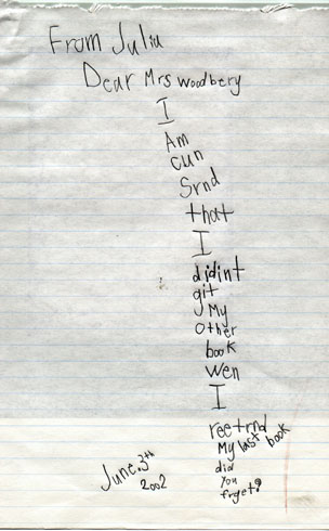 - The activist's first letter to an official. Mom's only help was spelling the word "other." Yes, she did get the results she wanted and completed the 60th and final book in the optional reading series. June 3, 2002.