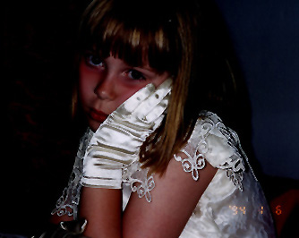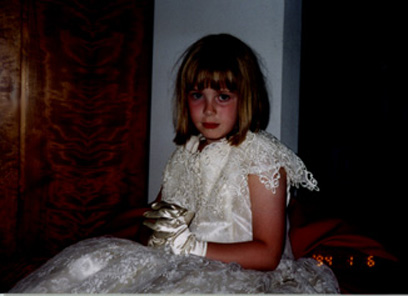 - Julia, still sunburned from our vacation in Oceanside, wearing my wedding dress: 1, 2, 3. September 1, 2002.