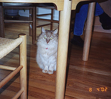 - Julia's photographs: Buddy, one of our two cats, under the dining room table. Joel, with Jim hiding behind him, at the David/Sue Ellen/Jim/Julia birthday party. April 2002.