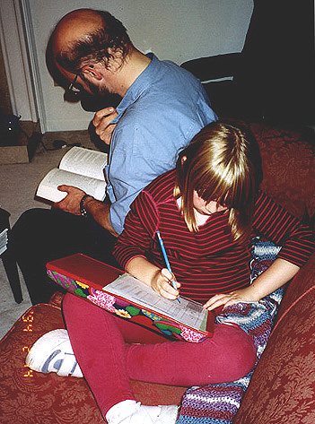 - Her favorite place and way to do homework. Note how she holds her pencil. October 2002.